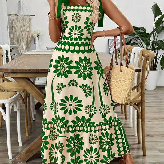 Women'S Green Floral Print Off-Shoulder Maxi Dress with Lace-Up Detail - Perfect for Summer Beach Vacations, Beach Dress | Floral Print Dress | Laceup Detail, Beach Clothes