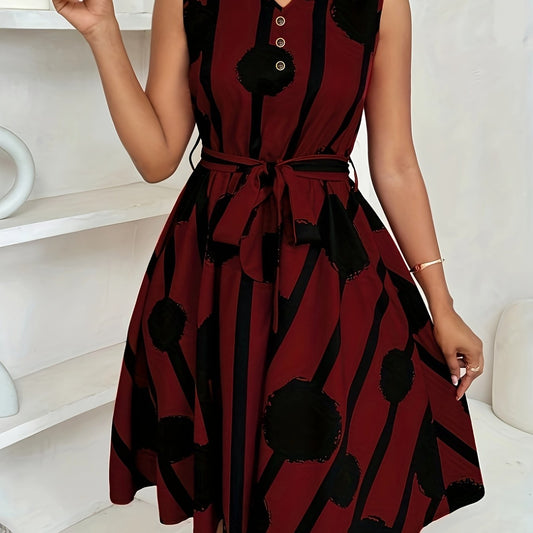 Women's Elegant Paisley Print A-Line Dress with Adjustable Waist Tie - Lightweight Summer Casual & Party Dress, Round Neck Short Sleeve, Machine Washable Black & White Geometric Pattern, Smooth Texture Fabric