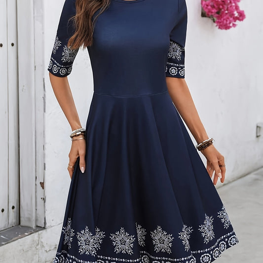 Women's Elegant Navy Blue Digital Print A-Line Dress - Short Sleeve Round Neck with Lace Trim, Machine Washable All-Season Versatile Casual to Formal Wear, Floral Bird Motif, Nontransparent Fabric