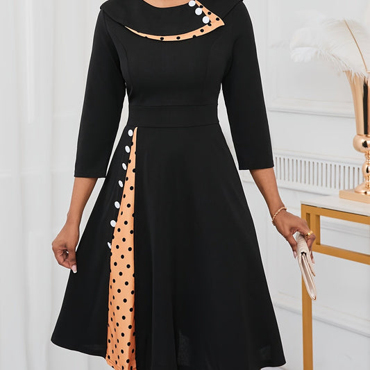 [Elegant A-Line Dress] Elegant A-Line Dress | Women's Black with Orange & White Polka Dots, Round Neck, Machine Washable, All-Season Versatile for Casual & Formal Occasions, Comfortable Fabric, Office Attire, Sophisticated Style, Maxi Dress