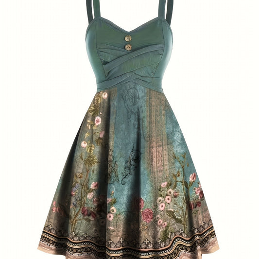 Vibrant Floral Print Cross Strap A-Line Cami Dress - Elegant Sleeveless Sweetheart Neck Dresses for Spring & Summer - Women's Clothing with Flattering Fit